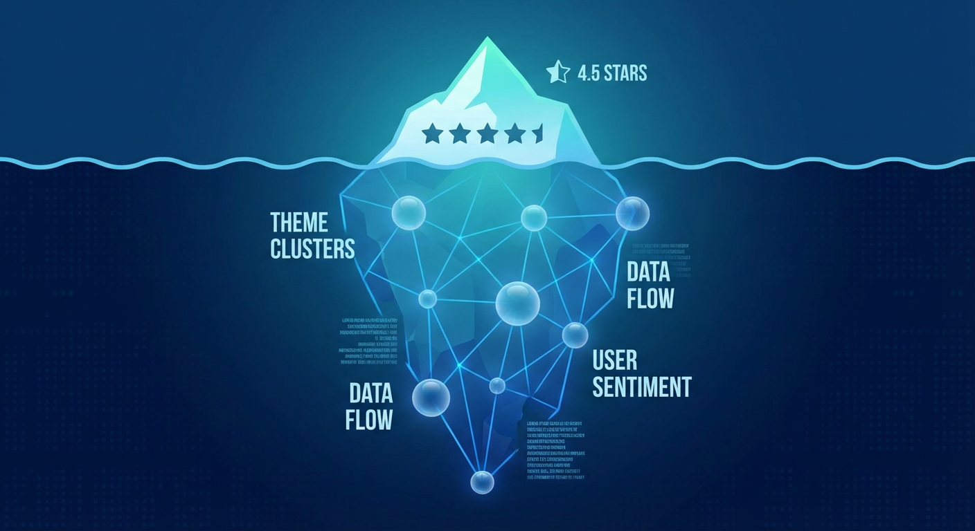 Think of every review as an iceberg. The star rating is the tiny visible tip. Below the waterline is the actual intelligence: specific feature complaints, workflow descriptions, competitor comparisons, emotional language about support experiences, and offhand comments about why they almost switched.