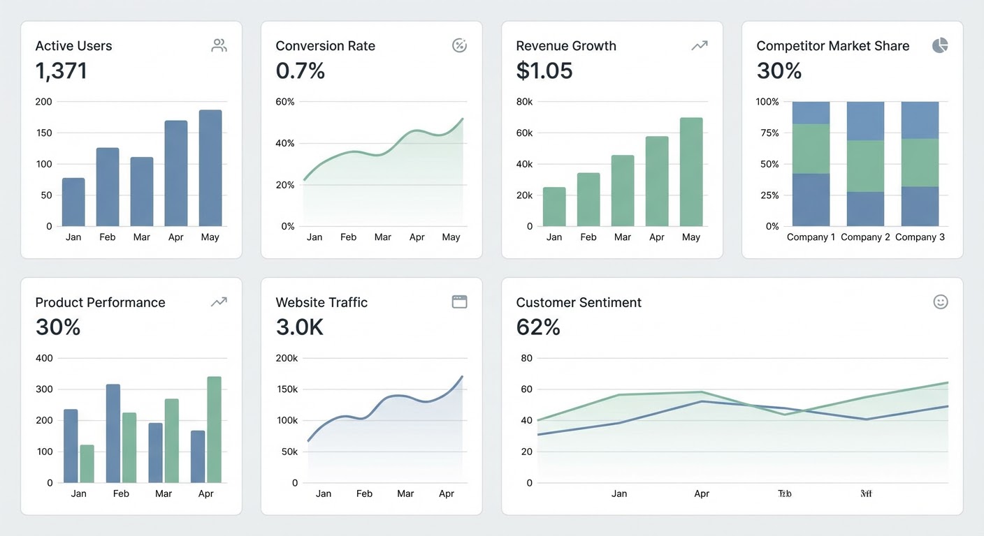 Traffic growth rate → Should we change our acquisition strategy? Channel mix → Where should we invest? Review sentiment → What should sales emphasize? Feature velocity → How fast is the gap closing or opening? Content signals → Where are competitors headed? Pricing position → Should we adjust our pricing? Win rate → Where are we losing and why?
