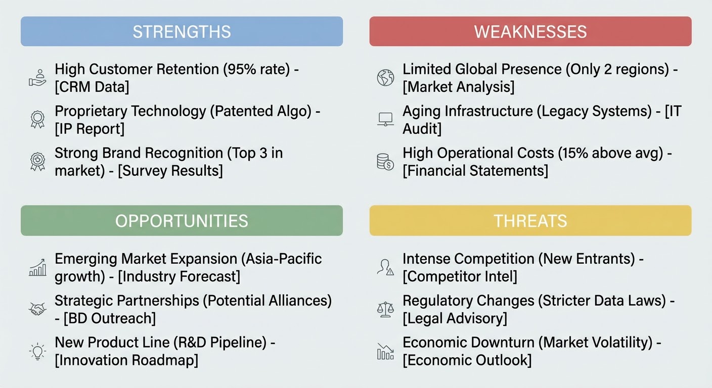 The traditional SWOT format invites speculation. You stare at four empty quadrants and ask people to fill them in. What happens? The loudest person in the room writes their opinions on the whiteboard and everyone else nods. Nobody says "how do we know that?" because it feels confrontational.