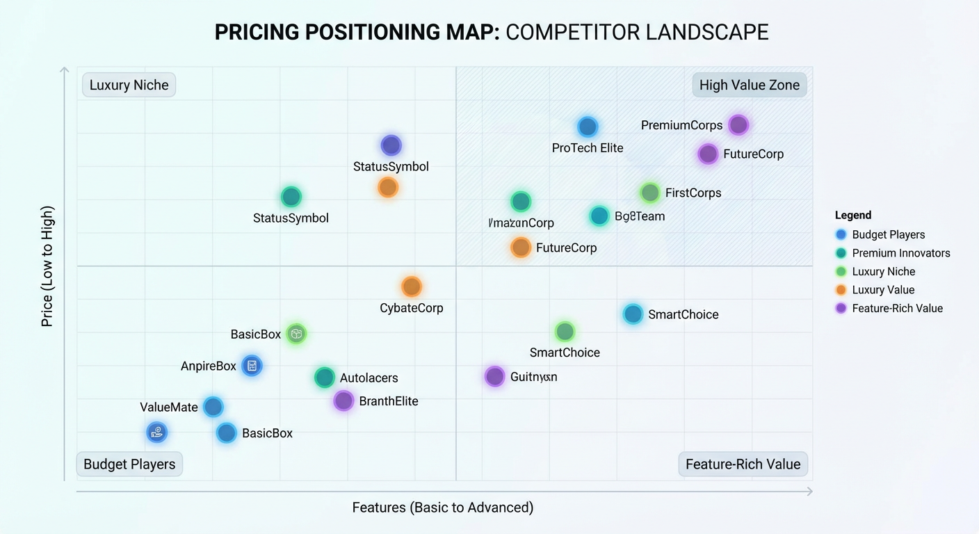 Take the feature/tier matrix and turn it into a visual. The classic positioning map uses two axes: price (low to high) on the X-axis and feature depth (basic to full-featured) on the Y-axis. Plot every competitor.