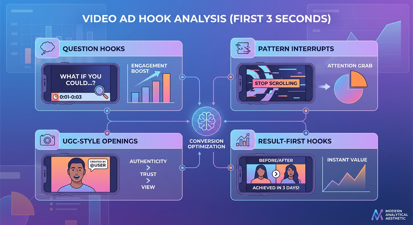 - UGC hooks. Someone talking to camera, no logo visible, filmed on a phone. Looks like organic content for the first few seconds. If competitors are running UGC hooks and those ads have been live for weeks, their audience trusts real-looking people more than polished brand creative.