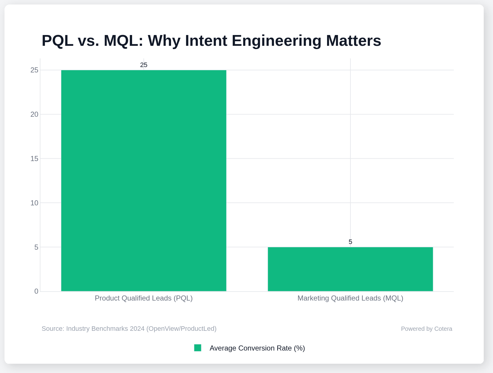 This level of automation doesn't just save time: it changes the conversion math. As you can see in the chart below, Product Qualified Leads (PQLs) convert at nearly 5x the rate of traditional Marketing Qualified Leads (MQLs).
