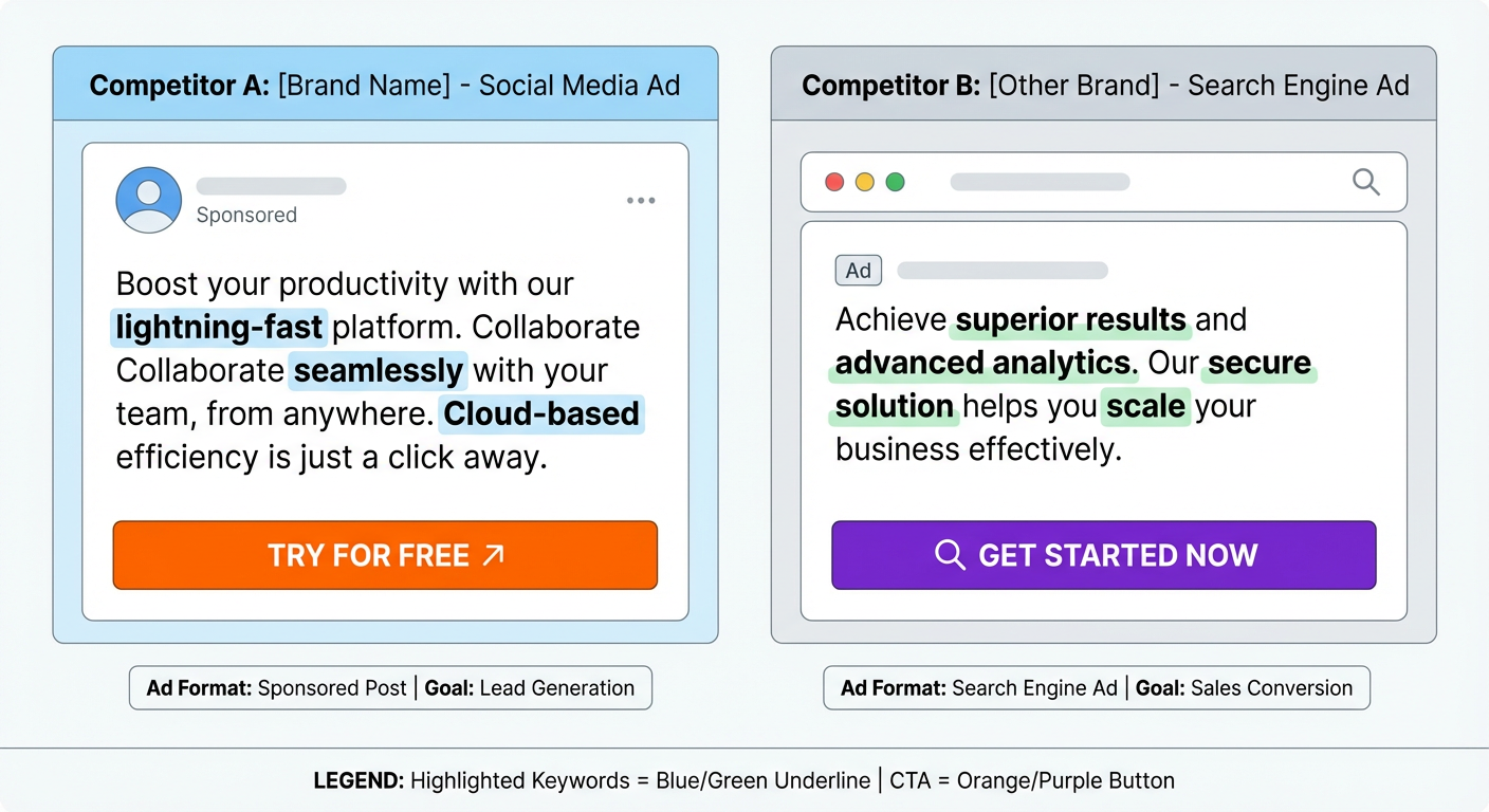 This is the piece most people skip during google ads competitor analysis because it's the hardest to quantify. But creative direction — the visual language, the tone, the format choices — reveals positioning decisions that keyword data alone can't tell you.