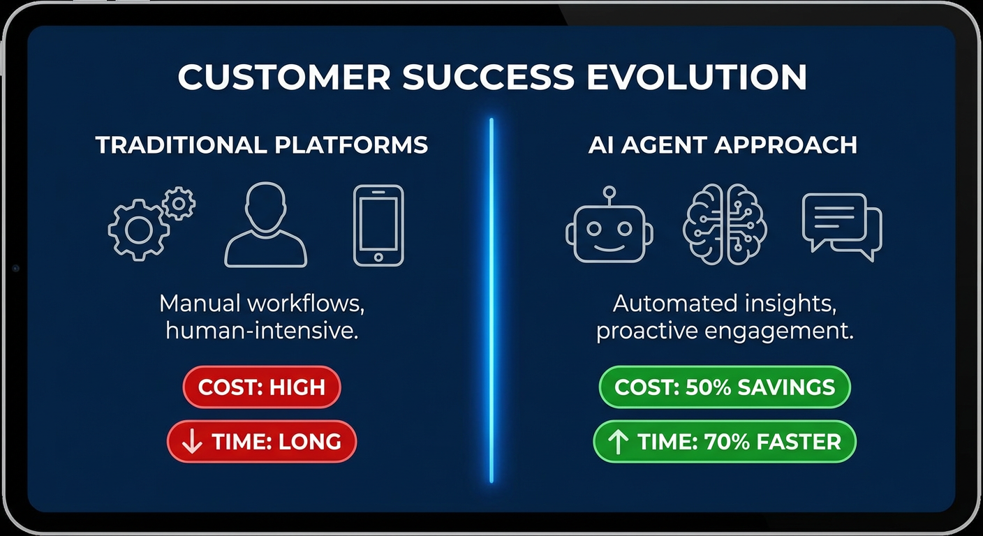 The expensive parts of Gainsight—health scoring, automated playbooks, NPS follow-up, churn risk detection—can be done by AI agents running on top of Vitally, ChurnZero, or whatever CS tool you already use. You get the same outcomes. You skip the six-figure contract.