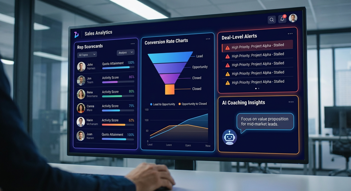 Second, weekly coaching scorecards. Per-rep breakdowns of conversion rates at each stage, activity volume by type, and the specific anomalies worth discussing. Your Monday meeting gets shorter and more useful.